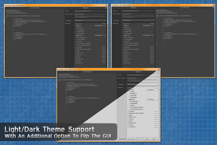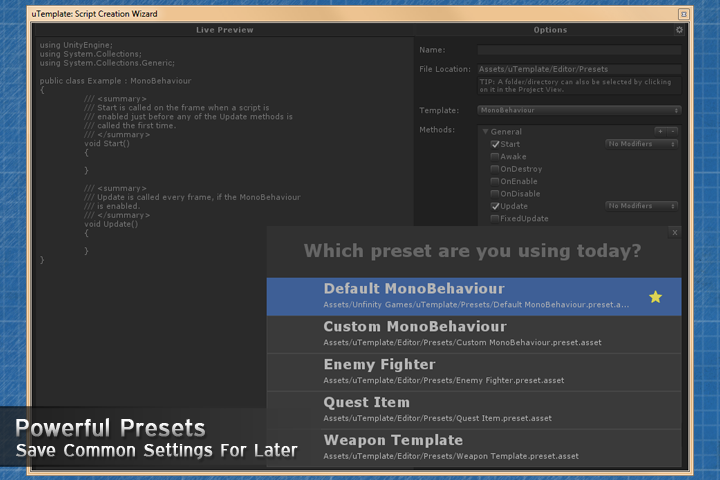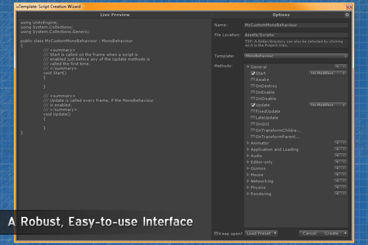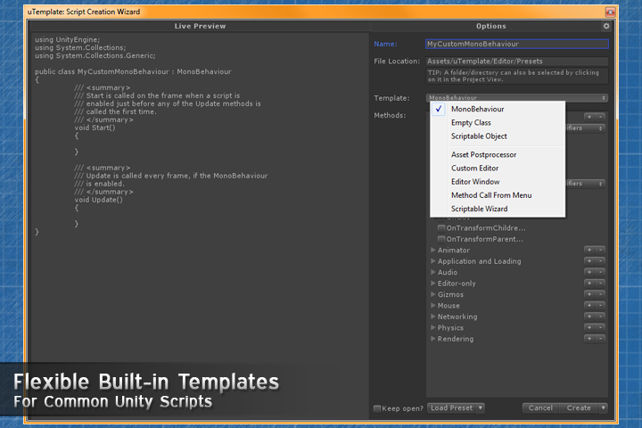 uTemplate comes with full support for all recent MonoBehaviour methods, making it easy to build out a new script (or preset!) using newer Unity 5 functionality. Over 60 MonoBehaviour methods included!