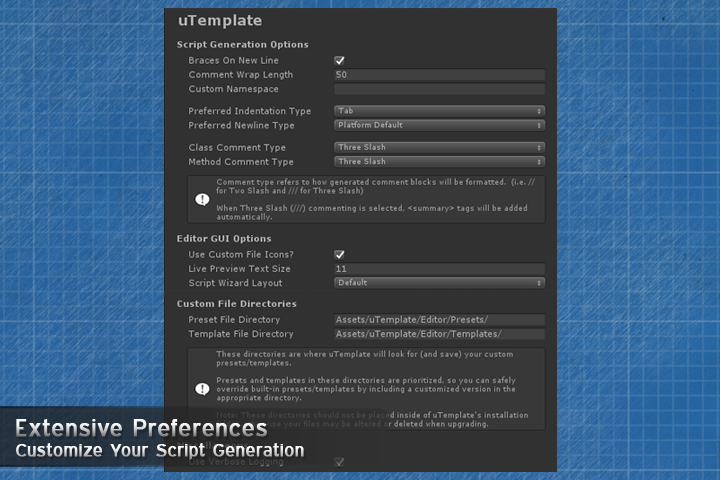 Customize almost every aspect of your generated scripts! Line-endings, comments, bracket positions, line indentation -- you name it. uTemplate is built to be customizable (check the docs for more!). Say goodbye to fixing Unity's generated default scripts!